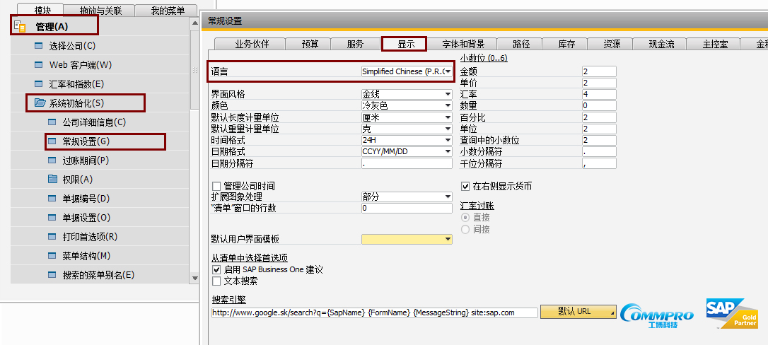 打开B1系统,选择【管理】模块中的【系统初始化】,点击【常规设置】。在常规设置中,选择【显示】页面,在【语言】处选择您要切换的语言。